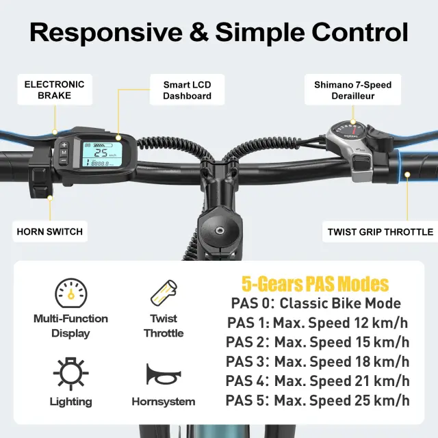 Večfunkcijski LCD-zaslon na prvi pogled prikazuje hitrost, raven PAS, podatke o potovanju in stanje baterije. Z odklepanjem brez ključa NFC dobite hiter in varen dostop za vsakodnevno vožnjo na delo.