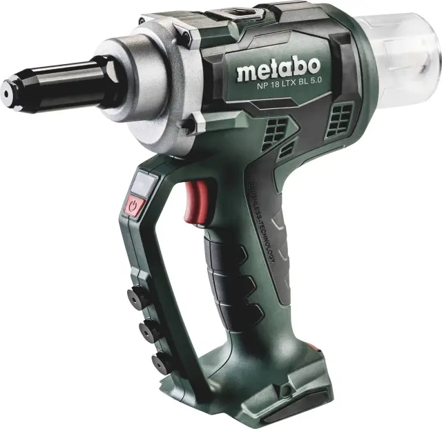 Akumulatorska kovinska pištola za izjemno hitro kovičenje primerljiva z napravami za stisnjen zrak. 100% združljiva z vsemi akumulatorji Metabo 18 Volt. Dolga življenjska doba zaradi brezkrtačnega motorja in robustne natančnosti menjalnika. Z držali ustniki za eno roko: vstavljena zakovica drži v vsakem položaju. Prozorna zbiralna posoda za enostavno praznjenje preostalih trnov. Hitra zamenjava ustnika za različne premere zakovice zaradi integriranega orodja. Varno delo zaradi robustne roke. LED svetlobo za optimalno osvetlitev med zakovanjem lahko izključite za odsevne površine. Ergonomska oblika za udobno delo tudi v kotih. Robustno uho za varčevanje z energijo z napetostjo balanserja / vzmeti. S praktičnim kavljem za pas\, ki ga lahko pritrdite desno ali levo. Baterijski paketi z indikatorjem zmogljivosti za preverjanje stanja napolnjenosti. Tehnologija Ultra-M: najvišja zmogljivost\, nežno polnjenje.Besedilo je strojno prevedeno.