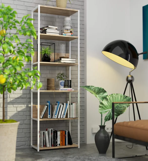 Metalna loft polica je praktičen in moden kos pohištva, ki se bo dobro podal tako v dnevni sobi kot v pisarni. Polica ima belo kovinsko ogrodje in 6 polic v barvi sonomskega hrasta. Police so izdelane iz laminirane plošče debeline 16 mm. To je trden in vzdržljiv material, ki se odlikuje po visoki odpornosti na obrabo. Robovi so dodatno zaščiteni z ABS robom, kar zagotavlja, da bo pohištvo vedno izgledalo dobro, tudi pri zelo intenzivni vsakodnevni uporabi. Polica je opremljena s 6 policami, na katere lahko postavite predmete, ki jih želite prikazati ali jih preprosto imeti pri roki. Celota izgleda zelo stilno in moderno.