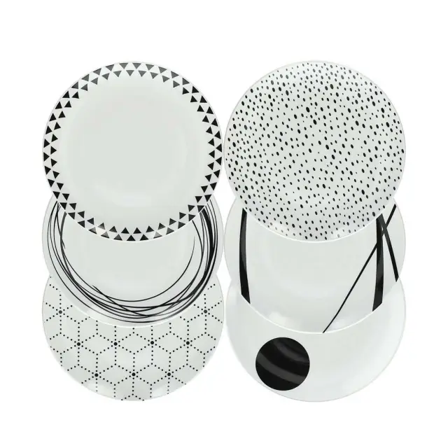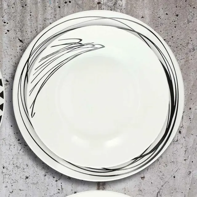 18-delna garnitura krožnikov Tognana iz linije METROPOLIS GRAPHIC iz finega porcelana je sestavljena iz 6 plitvih, 6 jušnih in 6 desertnih krožnikov. Vsak posemezni kos jedilnega kompleta krasijo različni abstraktni in kreativni vzorci v črnih linijah. Dopolnite izgled vaše mize še z enakimi čajnimi ali kavnimi skodelicami kolekcije Metropilis Graphic.
