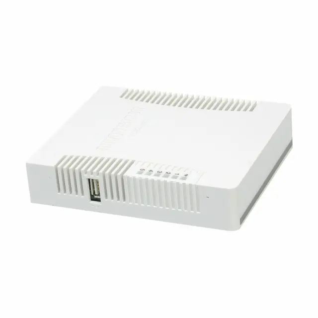 Mikrotik brezžični usmerjevalnik za SOHO uporabo, kateri deluje na frekvenci 2.4GHz do hitrosti 300 Mbit/s in vsebuje 5 gigabitnih vrat ter 1x USB tipa-A.