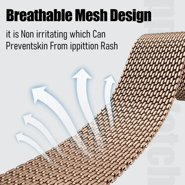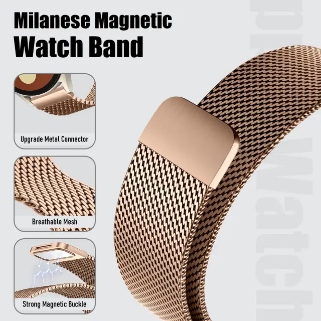 Elegantno Rožnato Zlato: Izdelana z natančnostjo, ta milanese zanka za uro ima osupljiv zaključek iz rožnatega zlata, ki vaši pametni uri doda pridih prefinjenosti. Barva je dosežena z naprednimi tehnikami prevleke, ki zagotavljajo dosleden in dolgotrajen odtenek, ki dopolnjuje vsak slog. Njena gladka tekstura je prijetna na koži, zaradi česar je idealna za celodnevno nošenje, ne glede na to, ali ste v pisarni, telovadnici ali uživate v večernem izhodu.
