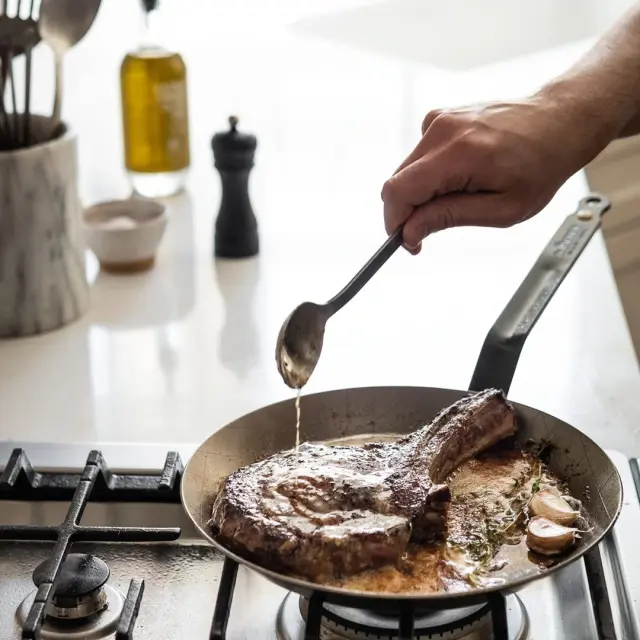 De Buyer ponev za steak Mineral B je videti kot stara kovana posoda z dolgim, ukrivljenim ročajem v francoskem slogu, ki omogoča enostavno rokovanje. Večkratna uporaba izboljša lastnosti naravnega nelepljivega sloja, pri visokih temperaturah pa železo še dodatno karamelizira sokove in naredi zrezek še bolj okusen in sočen. Notranji premer dna ponve za zrezke meri 21,3 cm. Ponve iz linije MINERAL B so narejene iz visokokakovostnega železa, prevlečenega s čebeljim voskom, ki ustvari zaščitni premaz pred oksidacijo, hkrati pa je to tudi naravna obloga proti sprijemanju živil pri prvi uporabi. Z vsako nadaljnjo rabo bo ponev postala temnejša, hrana pa se bo na ta način vse manj prijemala na dno posode. Ponev je primerna za vse kuhalne površine, vključno z indukcijo. Ne uporabljajte detergentov in ponve ne vstavljajte v pomivalni stroj. Ponev po vsaki uporabi sperite z vročo vodo, jo osušite, nato pa jo rahlo premažite z oljem in shranite v suhem prostoru, da preprečite rjavenje.
