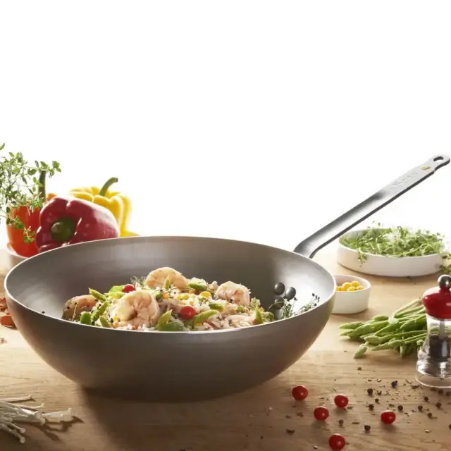 De Buyer vok je popolna wok-ponev za zdrav in hiter način kuhanja, idealna za naravno in dietetično kulinariko z majhno uporabo maščob. Ponev premera 28 cm se hitro segreje in toplota se enakomerno razporedi, kar ustvari Maillardovo reakcijo, hrana pa se v takšni ponvi odlično karamelizira. Ravno dno, ki meri 13,7 cm, je izredno stabilno. Ponve iz linije MINERAL B so izdelane iz visokokakovostnega železa, prevlečenega s čebeljim voskom, ki ustvari zaščitni premaz pred oksidacijo, hkrati pa je to tudi naravna obloga proti prijemanju živil pri prvi uporabi. Z vsako nadaljnjo uporabo ponve se izboljša lastnost naravnega nelepljivega sloja. Ponev lahko uporabljate na vseh kuhalnih površinah, vključno z indukcijo. Ne uporabljajte detergentov in ponve ne vstavljajte v pomivalni stroj. Po vsaki uporabi jo sperite z vročo vodo, jo osušite, nato pa jo rahlo premažite z oljem in shranite v suhem prostoru, da preprečite rjavenje. Ponev bo z uporabo postala temnejša, vendar z upoštevanjem pravil rokovanja z železno posodo bo del vaše kuhinjske posode še desetletja.