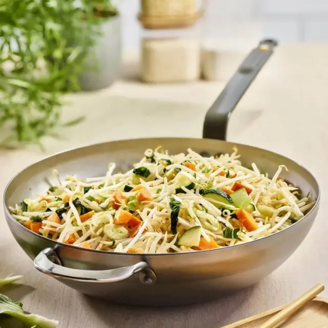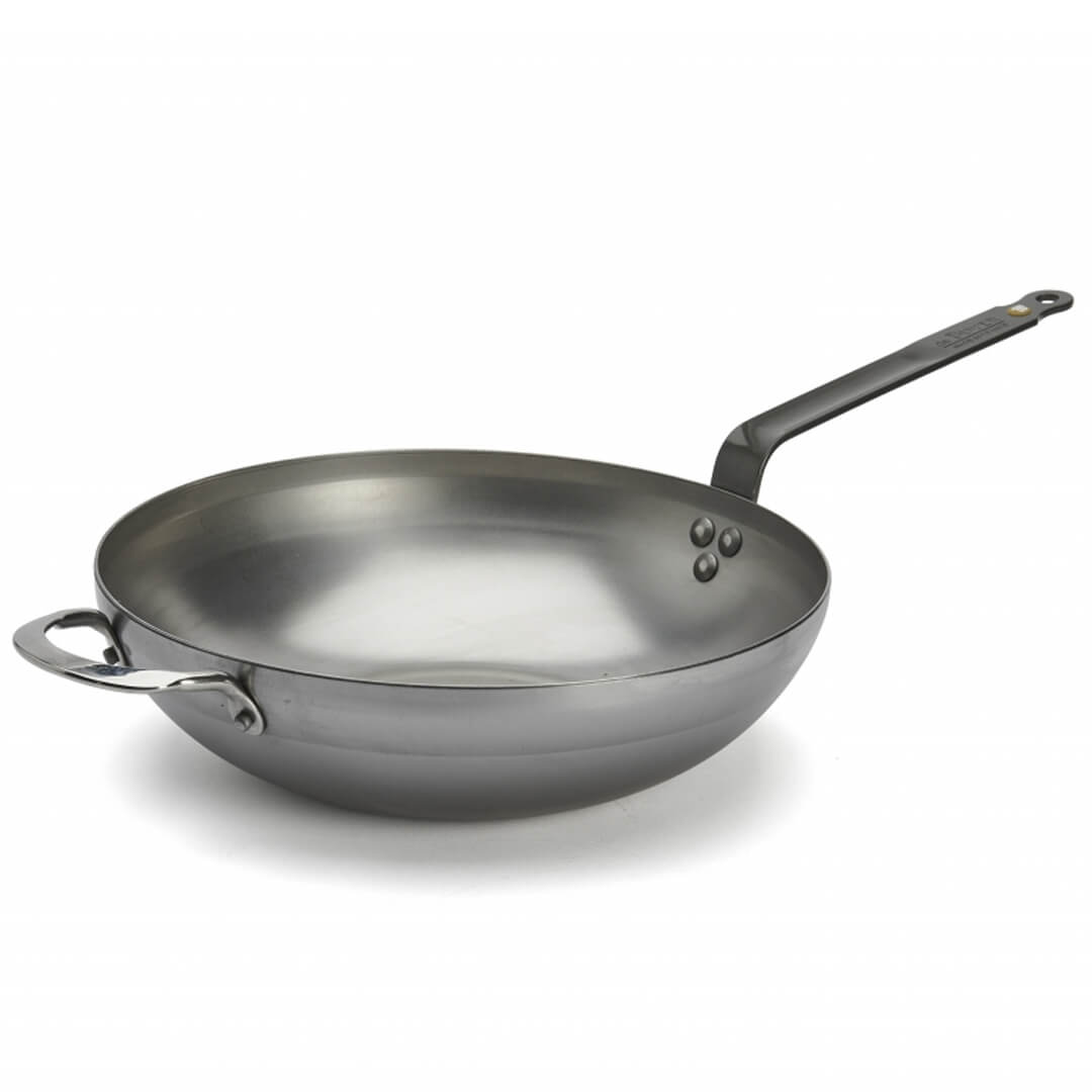 De Buyer vok je popolna wok-ponev za zdrav in hiter način kuhanja, idealna za naravno in dietetično kulinariko z majhno uporabo maščob. Ponev premera 32 cm se hitro segreje in toplota se enakomerno razporedi, kar ustvari Maillardovo reakcijo, hrana pa se v takšni ponvi odlično karamelizira. Ravno dno, ki meri 16 cm, je izredno stabilno. Ponve iz linije MINERAL B so izdelane iz visokokakovostnega železa, prevlečenega s čebeljim voskom, ki ustvari zaščitni premaz pred oksidacijo, hkrati pa je to tudi naravna obloga proti prijemanju živil pri prvi uporabi. Z vsako nadaljnjo uporabo ponve se izboljša lastnost naravnega nelepljivega sloja. Ponev lahko uporabljate na vseh kuhalnih površinah, vključno z indukcijo. Ne uporabljajte detergentov in ponve ne vstavljajte v pomivalni stroj. Po vsaki uporabi jo sperite z vročo vodo, jo osušite, nato pa jo rahlo premažite z oljem in shranite v suhem prostoru, da preprečite rjavenje. Ponev bo z uporabo postala temnejša, vendar z upoštevanjem pravil rokovanja z železno posodo bo del vaše kuhinjske posode še desetletja.