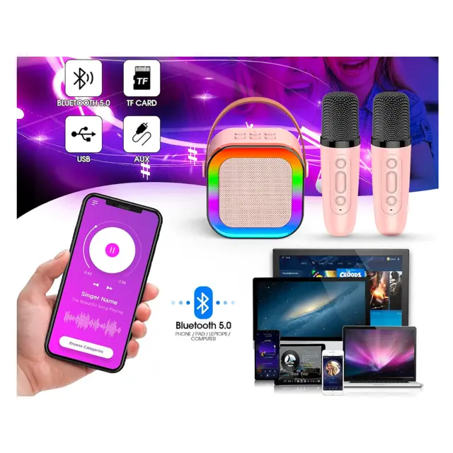 Vključena sta 2 brezžična mikrofona za duo karaoke s tehnologijo proti motnjam za čiste in gladke vokale.. Kompaktni zvočnik Bluetooth z vgrajenimi svetlobnimi učinki RGB za takojšnje vzdušje zabave. 5 načinov spreminjanja glasu in prostorski zvok 3D za prilagajanje vsakega nastopa. Dolga življenjska doba baterije do 5 ur in možnost polnjenja prek USB-C za neomejeno uporabo.