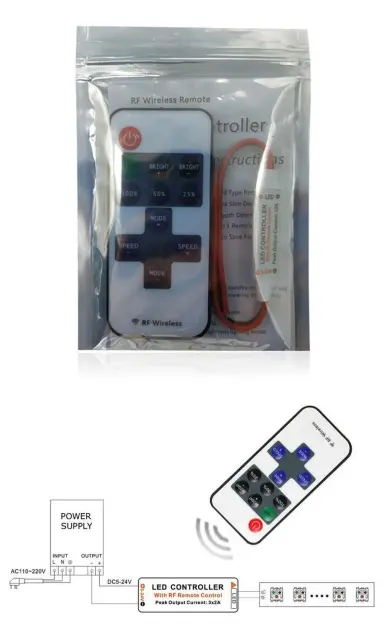 Mini krmilnik z RF daljinskim upravljalnikom, za notranjo uporabo (IP25). Omogoča krmiljenje 12V ali 24V LED trakov.