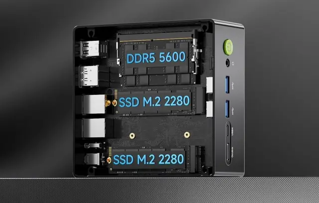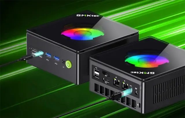 GMKtec K11 se ponaša z izjemno široko paleto priključkov, zasnovanih z mislijo na potrebe profesionalnih uporabnikov. Na ohišju boste našli HDMI 2.1 (8K / 60 Hz), DisplayPort 2.1 (8K / 60 Hz) ter dva USB4 (USB-C) priključka – kar omogoča priklop do štirih monitorjev hkrati.
