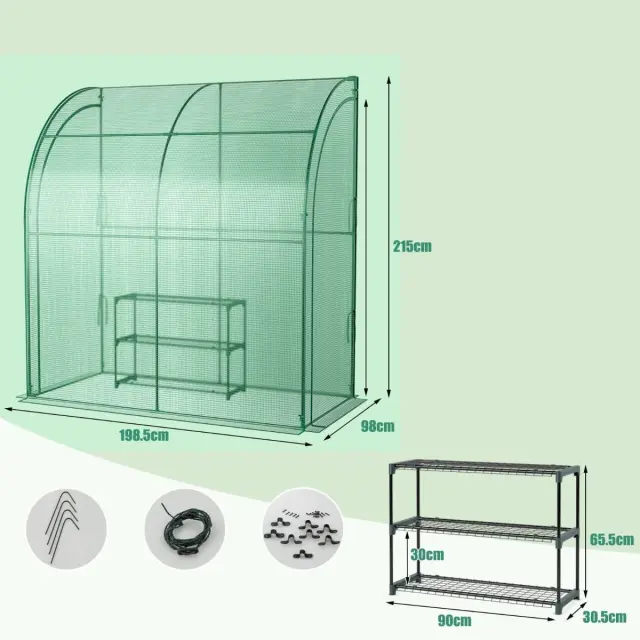 Zasnova Walk-in in enostavna montaža: Vrtni rastlinjak ima 2 velika dvižna vrata, ki jih je mogoče enostavno odpreti ali zapreti z zadrgami in pritrditi s trakovi, kar spodbuja boljše kroženje in konvekcijo zraka. V rastlinjak je priročno vstopati z dveh strani. Poleg tega za sestavo okvirja in rastlinjaka ni potrebno nobeno orodje, zato ga lahko v nekaj minutah preprosto in brez težav postavite.