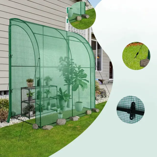Varčuje s prostorom in je vsestransko uporaben: Za razliko od prostostoječih rastlinjakov se ta prenosni poševni rastlinjak pritrdi na stranico hiše, skednja ali druge obstoječe strukture, na katero se lahko nasloni, zato ne zavzame veliko prostora in ga lahko postavite na dvorišče, vrt, balkon, teraso, kmetijo ali kamor koli želite.