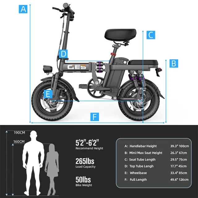 Številka modela: GE5Doseg na enoto moči: 10–30 kmNajvečja hitrost: 25 km/hNavor: 50–60 NmMoč motorja: 250 WBaterija: 48 V 15 Ah litijeva baterijaČas polnjenja: 5–8 urZavorni sistem: Sprednje in zadnje kolutne zavoreVzmetenje: Blaženje udarcevVelikost koles: 14 palcev, vakuumska pnevmatikaMaterial okvirja: Visokoogljično jekloNormalno: 124*109*50,5 cmZloženo: 73*40*53 cmTeža kolesa: 32 kg