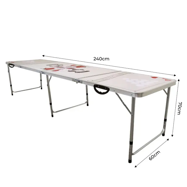 * Â Izboljšajte svojo izkušnjo zabavne igre z našo 8ft dolgo zložljivo mizo za pivski pong, zasnovano za nepozabne trenutke tekmovanja. S svojim značilnim dizajnom in izjemnimi lastnostmi je ta miza najboljši pripomoček za vsako pijančevanje ali družabno srečanje.
