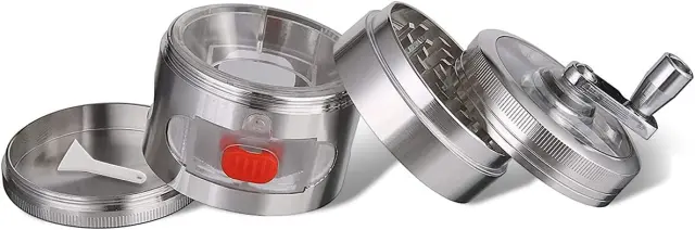 EDINKATNA OBLIKA --- 4-delni 3-komorni mlinček za zelišča omogoča mletje, shranjevanje in filtriranje cvetnega prahu. Ročni mlinček za zelišča poveča užitek pri mletju, prozoren zgornji del vam omogoča opazovanje celotnega procesa mletja. Razširljivi predali vam omogočajo, da kadar koli vzamete ven.