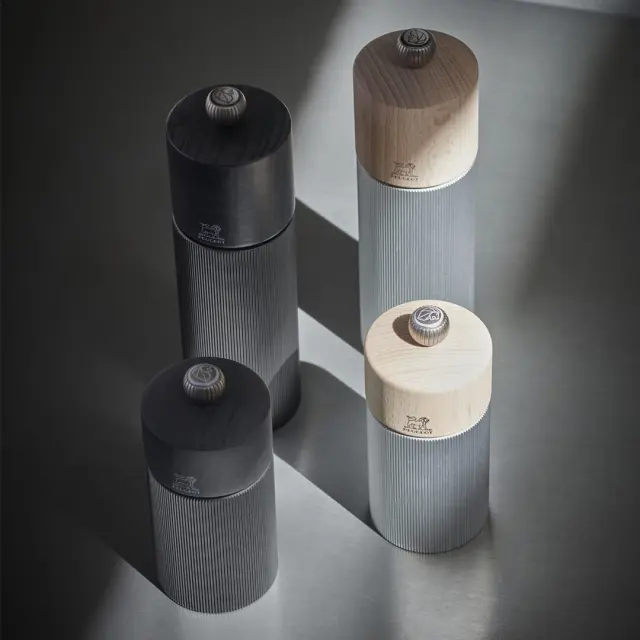 Mlinček za poper Line Dark (18 cm) združuje čudovito skandinavsko estetiko z vrhunsko funkcionalnostjo. Njegovo ohišje iz črtastega temno sivega aluminija in vrh iz sivega lesa izžarevata sodoben šarm in toplino naravnih materialov. Mlinček je popoln dodatek za mizo ali kuhinjo, saj ponuja stilsko kombinacijo materialov in vrhunski grafični učinek. Peugeotov jekleni mehanizem, z doživljenjsko garancijo, je primeren za mletje zrn črnega, belega, zelenega, rdečega in roza popra ter koriandrovih zrn. S pomočjo vijaka oz. gumba prilagajate grobost - bolj kot je gumb zategnjen, bolj fino mlet je poper. Les uporabljen na vrhu mlinčka je pridobljen iz francoskih gozdov s certifikatom PEFC, kar poudarja zavezanost podjetja k trajnosti in odgovornemu ravnanju z viri. NAMIG: Mlinček dopolnite z ostalimi mlinčki iz iste linije Line.
