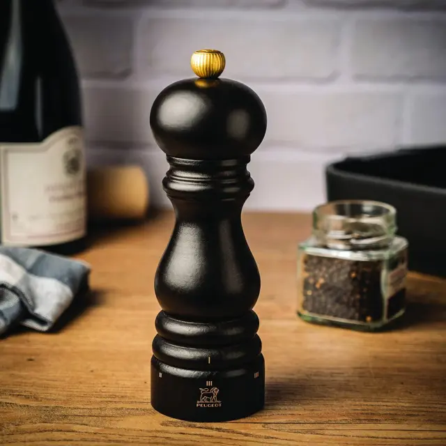 Peugeot mlinček za sol Paris Chocolat (15 cm) je izdelan iz bukovega lesa z elegantno oblikovano silhueto, ki jo dopolnjuje zlati gumb z vgravirano levjo glavo, ki je Peugeotov prepoznavni znak. Dvostopenjski mehanizem u’Select za mletje soli je izdelan iz posebej obdelanega nerjavečega jekla, ki ohranja zobe ostre in jih ščiti pred korozijo. Sprostite največ okusa in arome z lomljenjem in drobljenjem grobe soli do enake velikosti. Uporablja se lahko za mletje suhe soli. Ni primeren za morsko sol.