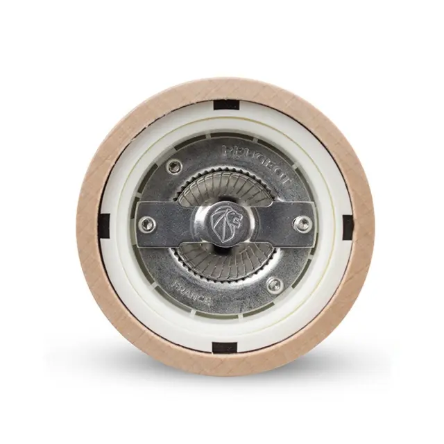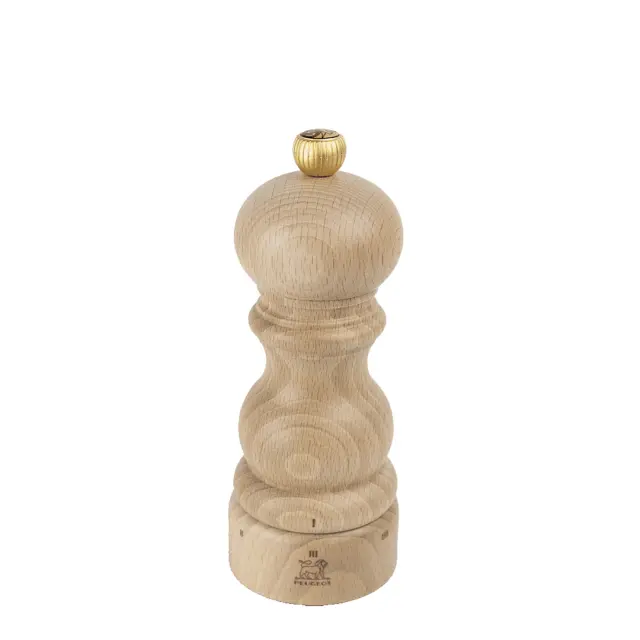 Peugeot mlinček za sol Paris Natur (15 cm) je izdelan iz lesa z elegantno oblikovano silhueto, ki jo dopolnjuje zlati gumb z vgravirano levjo glavo, ki je Peugeotov prepoznavni znak. Mehanizem u’Select za mletje soli je izdelan iz posebej obdelanega nerjavečega jekla, ki ohranja zobe ostre in jih ščiti pred korozijo. Sprostite največ okusa in arome z lomljenjem in drobljenjem grobe soli do enake velikosti. Uporablja se lahko za mletje suhe soli. Ni primeren za morsko sol.