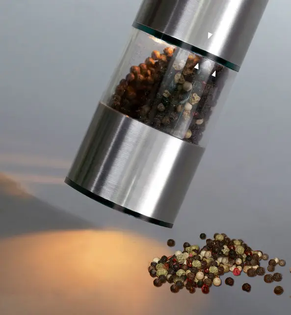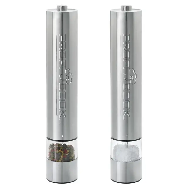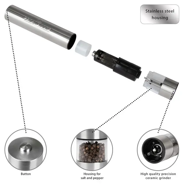 Visokokakovostni keramični mlinčki za poper in sol z nastavljivo grobostjo mletja. Kakovost mletja je konstantna. Prednost je enostavno polnjenje. Upravljate jih lahko z eno roko. Zunanji deli so izdelani iz nerjavečega jekla. Na dnu so opremljeni z osvetlitvijo za boljšo vidljivost med doziranjem. Za napajanje se uporabljajo 4x 1,5V baterije AA/Mignon/LR/AM3, ki pa niso priložene.