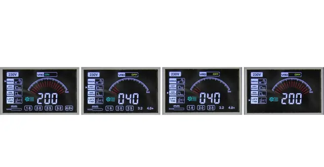 Zgornji indikator pove o priporočeni debelini elektrode za dani varilni tok. To je namig za uporabnike začetnike, po nastavitvi toka, ki ustreza izbrani elektrodi, se prikažejo popravki po preizkusih na materialu.