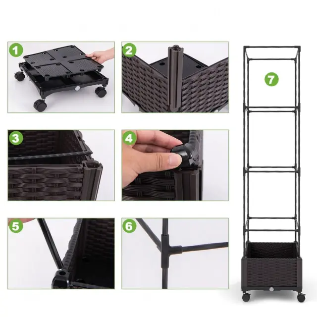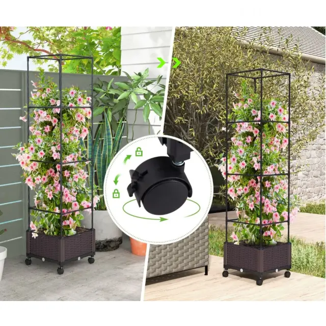 Naša večnamenska dvignjena greda je sestavljena iz zabojčka za sadike in rešetke ter ponuja veliko prostora za sajenje in zadostno navpično oporo za različne plezalke. Višina rešetke je nastavljiva in se prilagaja potrebam rasti različnih plezalk. Škatla za sadike je opremljena s sistemom za samooskrbo in drenažnimi luknjami, ki rastlinam pomagajo, da v celoti absorbirajo vodo in hranila, hkrati pa preprečujejo zamakanje. Izdelan je iz zanesljivih, s plastiko prevlečenih kovinskih drogov z nedrsečimi vzorci valov in robustnih PP plošč ter je idealen za dolgotrajno uporabo na prostem. Ima tudi 4 kolesca z možnostjo zaklepanja za udobje in prilagodljivost pri postavitvi za optimalno izpostavljenost soncu in kot dekorativni poudarek.