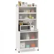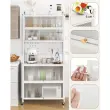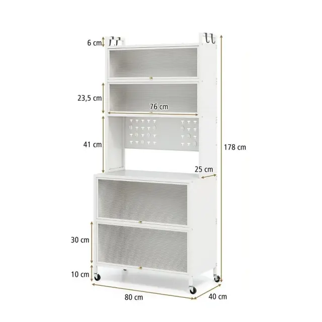 Spremenite način organiziranja z našo 6-stopenjsko kuhinjsko omarico! Z odprto zgornjo polico, prostorno delovno površino, 4 predali za shranjevanje, 4 kovinskimi stranskimi kavlji in perforirano steno z 10 kavlji ponuja bufetna omarica s polico več možnosti za shranjevanje za različne potrebe. Prozorna vrata s poklopci izboljšujejo vidljivost in dostop. Po potrebi pa lahko omarico preprosto premaknete s 4 univerzalnimi kolesci ali nastavljivimi podstavki za noge.