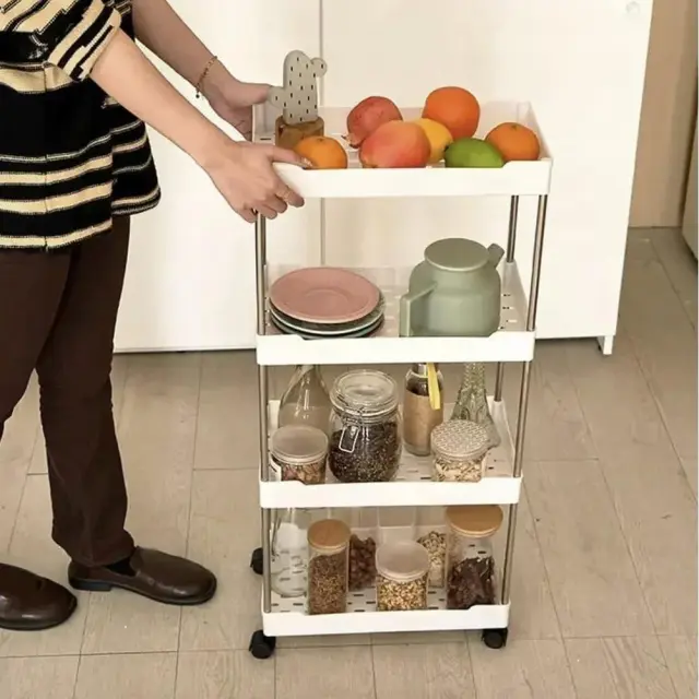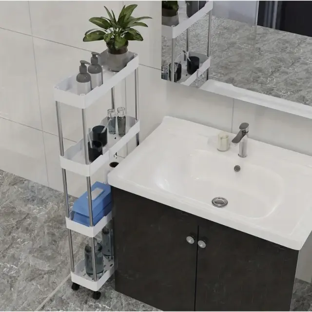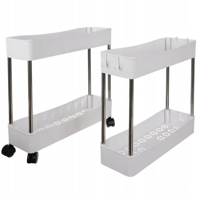 Njegova trpežna inox konstrukcija zagotavlja stabilnost in odpornost proti vlagi, medtem ko kompaktna zasnova (širina idealna za ozke prostore) omogoča, da ga preprosto namestite med pralni stroj, umivalnik ali stranišče. Zahvaljujoč vrtljivim kolesom ga lahko hitro premikate po prostoru, ko ga ne potrebujete, pa ga preprosto odmaknete.