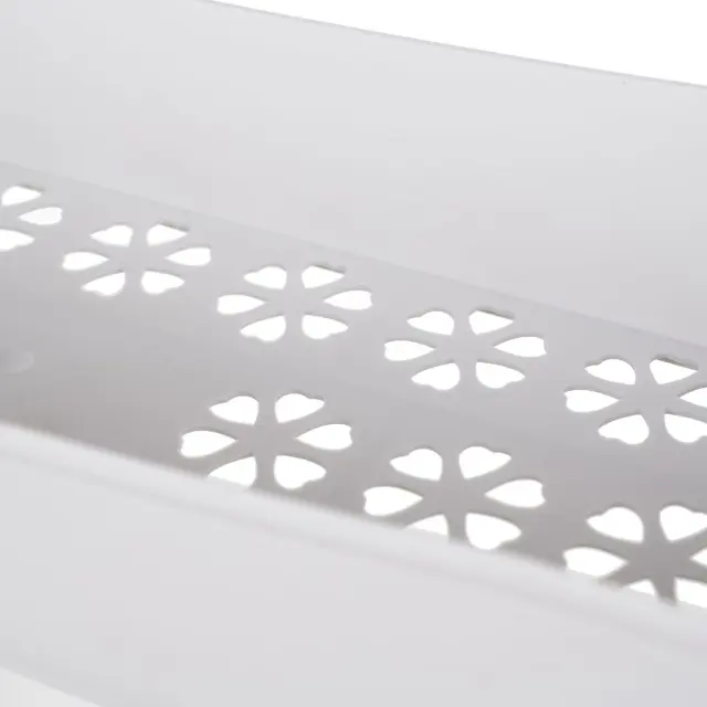 - ELEGANTNA OBLIKA – Izdelana iz visokokakovostnega PP (polipropilena) materiala, polica združuje vzdržljivost in lahkotnost, zaradi česar je enostavna za prenašanje ter odporna na vlago in praske . Vsaka polica ima lasersko izrezano dno v cvetličnem vzorcu s cvetnimi listi v obliki srca, kar doda subtilen čar in postane okrasni element kopalnice. Vzorec ne poudarja le estetike, temveč omogoča tudi boljše kroženje zraka, kar je pomembno v vlažnem kopalniškem okolju.