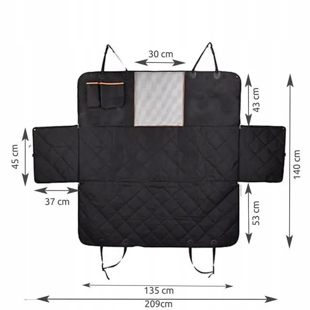 ENOSTAVNA NAMESTITEV IN VARNOST – podlogo enostavno razgrnete na zadnjem sedežu avtomobila in jo s kavlji pritrdite na vzglavnike in stranske ročaje; posebne reže za pasove omogočajo varno pritrditev živali.