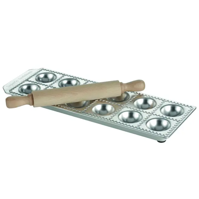 IMPERIA MODEL ZA RAVIOLE 12 RAVIOLICHEF iz linije RAVIOLAMP je izdelan iz aluminija in je odličen pripomoček za pripravo tradicionalnih italijanskih polnjenih testenin – raviolov. S tem kalupom boste pripravili 12 polnjenih blazinic iz testa v velikosti 52 x 52 mm. Za dobro stabilnost in zaščito občutljivih površin je kalup na spodnji strani opremljen z gumijastimi nogicami. Navodila: kalup za raviole pomokajte in ga pokrijte s sveže pripravljenim listom testenin, ki ga na tanko zvaljate s priloženim valjarjem ali pa s strojčkom za testenine. Testo nežno potisnite v odprtine in jih napolnite s polnilom po vaši izbiri. Robove rahlo namažite z rumenjakom ali vodo in nanje položite drugi list testenin. S pomočjo malega priloženega valjarja iz bukovega lesa stisnite obe plasti skupaj. Z rahlim pritiskom odstranite odvečen zrak in razrežite posamezne raviole. Ko boste kalup obrnili bodo ravioli padli iz njega. Preglejte vsak raviol in se prepričajte, da je ob robovih dobro zaprt. Položite jih na pomokan krožnik. Uživajte v pripravi okusnih domačih raviolov. Kalup pomijte ročno.