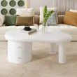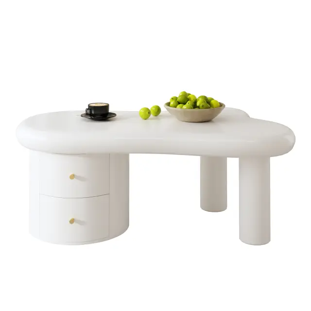 Moderna bela klubska mizica, nepravilne oblike, 2 predala, prihrani prostor