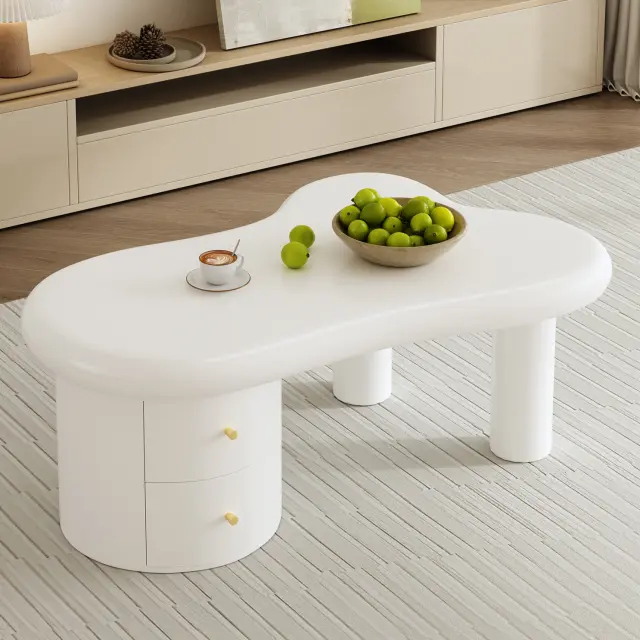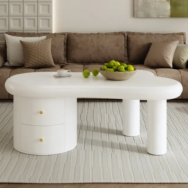 Moderna bela klubska mizica nepravilne oblike. Ponuja prostor za shranjevanje, je varna za otroke in večnamenska.