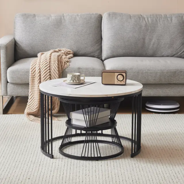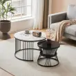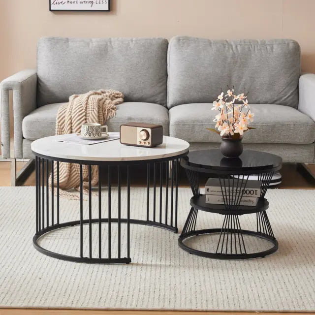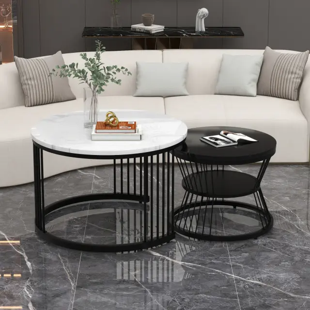 Moderna klubska mizica v obliki črke Gnezdo - visok sijaj, marmorni videz, okrogla, komplet 2 kosov, črn okvir