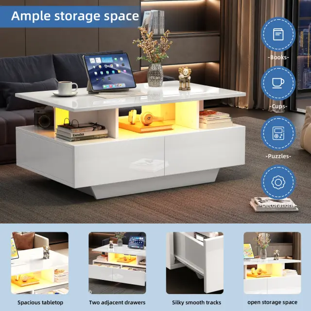 Moderna, bela klubska mizica z visokim sijajem, LED osvetlitvijo in dvema predaloma. Elegantna, funkcionalna in robustna (nosilnost: 30 kg). 90 x 55 x 41 cm.