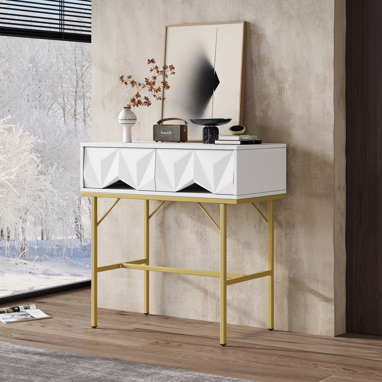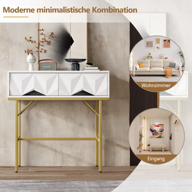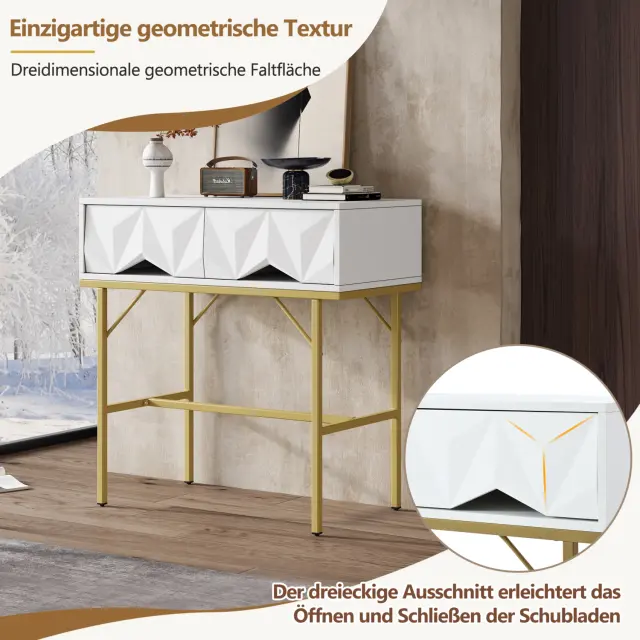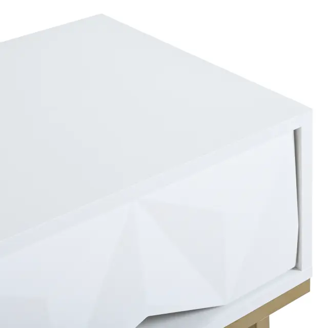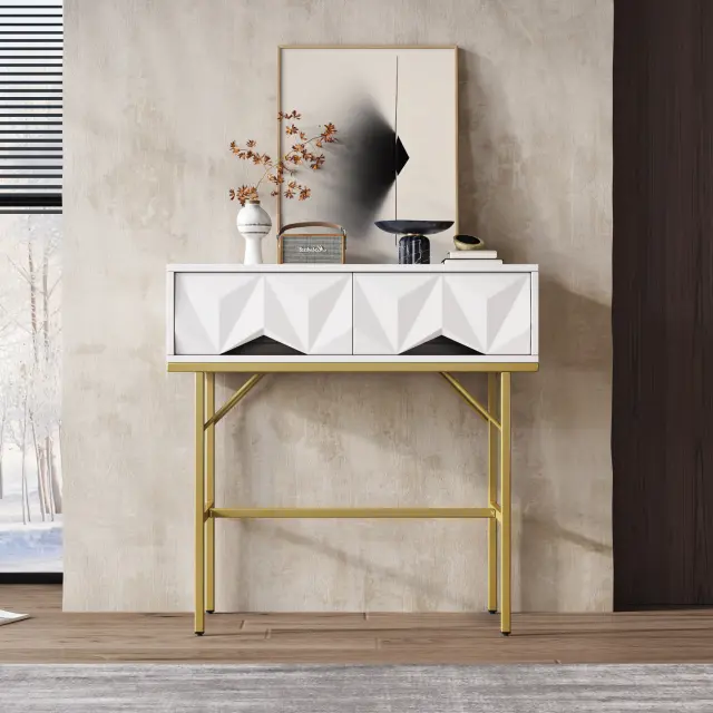 Moderna konzolna mizica, geometrijski dizajn, 3D predal, bela + zlata
