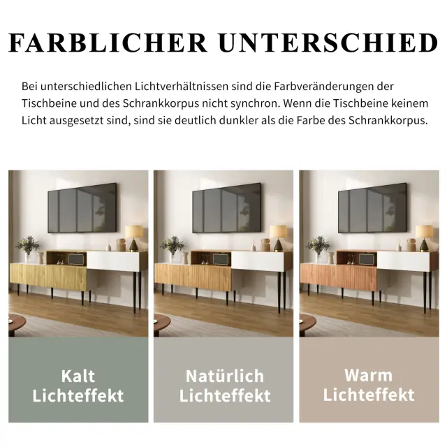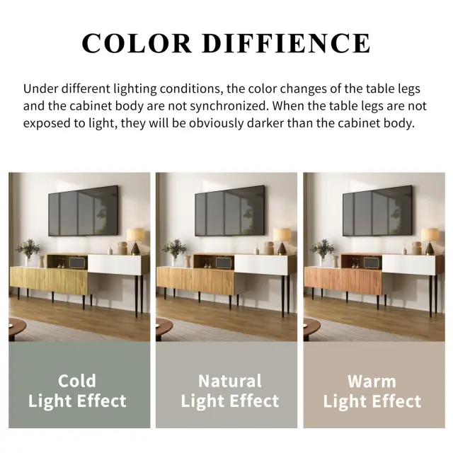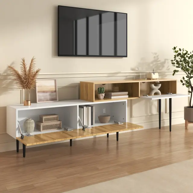 Moderna TV omarica z modularno zasnovo, lesnim vzorcem in belo površino, črnimi kovinskimi nogami, sistemom za upravljanje kablov in zaščito pred prevračanjem. Popolna za vsak bivalni prostor.