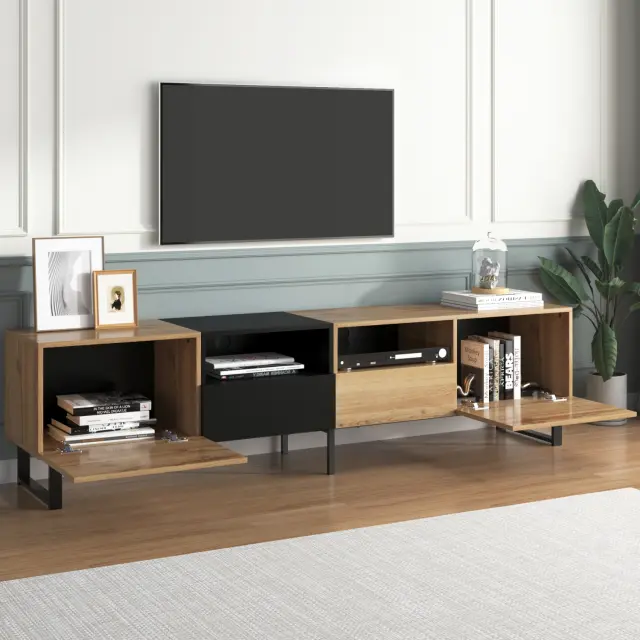 Moderna TV omarica v črni barvi z lesnimi vzorci - veliko prostora za shranjevanje, robustna konstrukcija