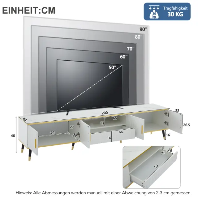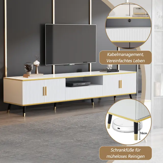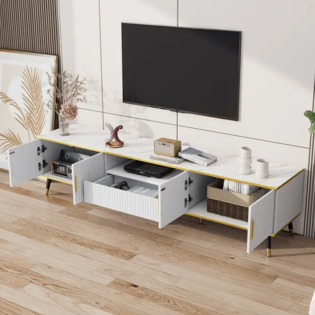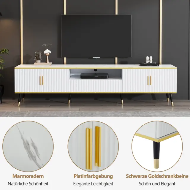 Ta 200 cm dolga bela TV stojnica z marmorno površino je primerna za televizorje do 90 palcev (237 cm). Ponuja veliko prostora za shranjevanje z 2 vrati, 1 predalom in sistemom za upravljanje kablov.