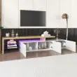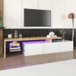 Moderna TV stojnica: visokosijajna bela, videz lesa, steklene police, LED osvetlitev