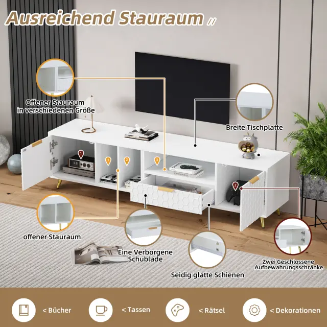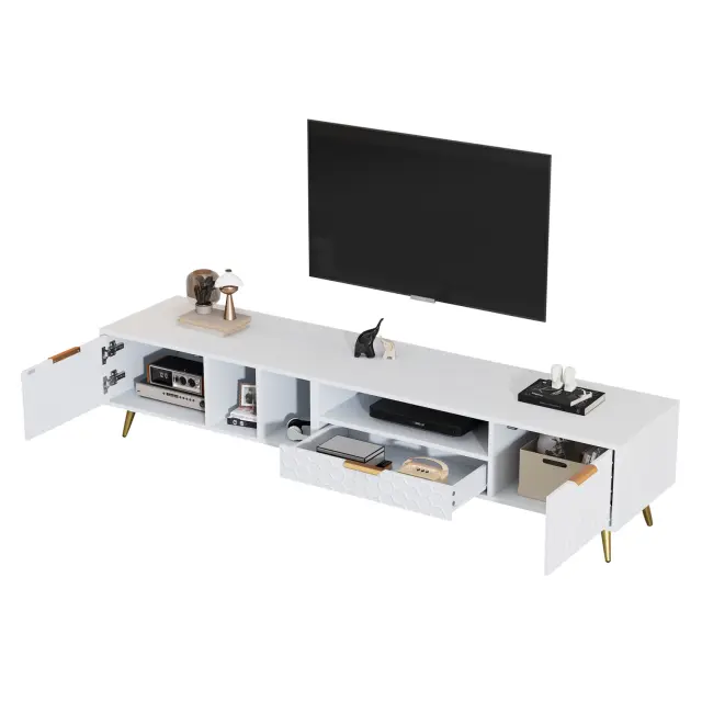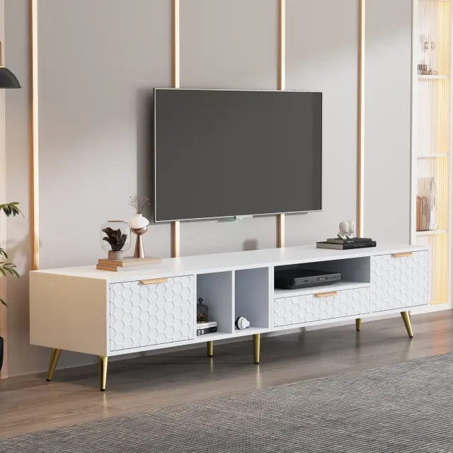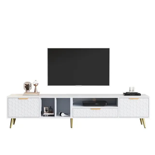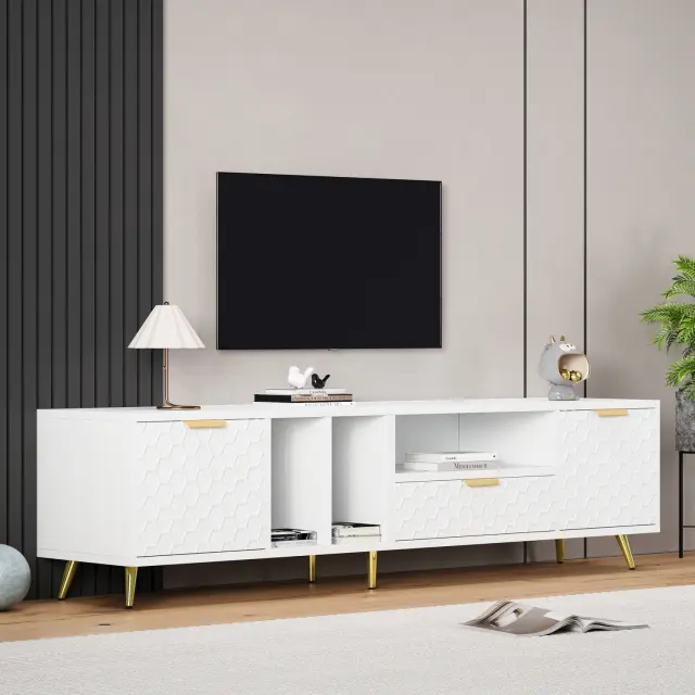 Ta bela TV omarica z vrati v obliki satovja, zlatimi ročaji in nogami ponuja razkošen prostor za shranjevanje. Je robustna, primerna za hišne ljubljenčke in družino ter ima sistem za upravljanje kablov.