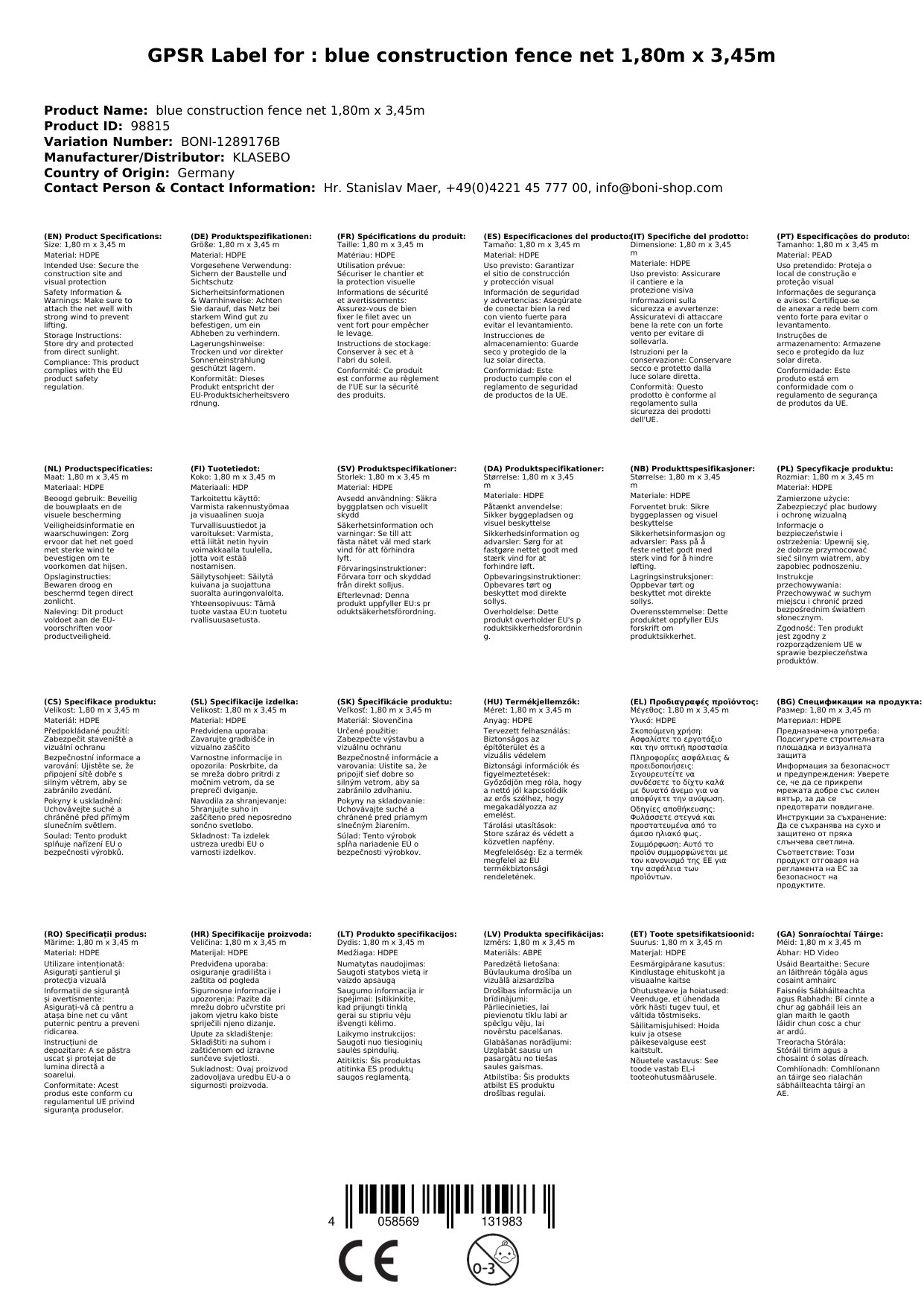 Modra zaščitna mreža za gradbišče 1,80m x 3,45m iz HDPE z UV-stabilnostjo in enostavno montažo