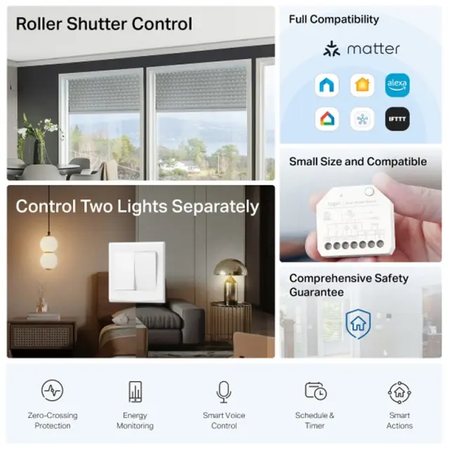 Tapo S112 je izjemno kompakten in vsestranski pametni modul, zasnovan za avtomatizacijo rolet, luči, talnega gretja in drugih električnih naprav, ne da bi morali zamenjati obstoječa stikala ali ožičenje. Zaradi podpore standardu Matter se brez težav poveže z vsemi večjimi pametnimi platformami, kar omogoča enotno in zanesljivo upravljanje celotnega doma. Modul je primeren tako za preproste kot napredne pametne scenarije, zato je odlična izbira za vsakogar, ki želi nadgraditi svoj dom na eleganten in učinkovit način.
