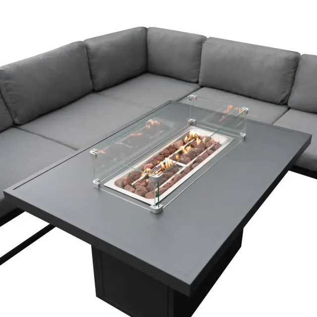 Osrednji del tega izjemnega kompleta je domiselno oblikovana miza za ogenj, ki doda očarljiv element vaši izkušnji na prostem. Brezhibno vgnezdeno v površino mize in napolnjeno z naravnimi vulkanskimi kamninami postane ognjišče osrednja točka, ki oddaja topel in vabljiv sijaj, ki vaš zunanji prostor spremeni v prijetno zatočišče.