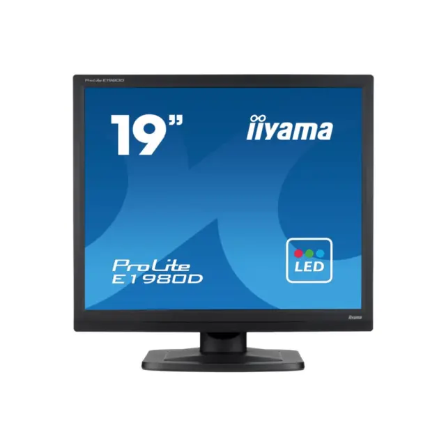 iiyama ProLite E1980D-B1. Diagonala zaslona: 48,3 cm (19"), ločljivost zaslona: 1280 x 1024 slikovnih pik, tip HD: XGA, tehnologija zaslona: LED, površina zaslona: mat, odzivni čas: 5 ms, izvorno razmerje stranic: 5:4, kot slike, horizontalno: 170°, vidni kot, vertikalno: 160°. nosilec VESA. Barva izdelka: Črna.