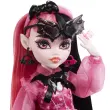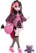 Šola se je začela in Monster High™ grozljive punce prihajajo v stilu, ki te bo šokiral! Lutka Draculaura™ se sprehaja po hodnikih Monster High™ v osupljivem stilu z moda srčastih kratkih hlač in vampirskem korzetu z prosojnimi rokavi. Njen grozljivo-fabulašen vampirski videz dopolnjujejo prosojne, nagubanih nogavice, rožnate platforme čevlji ter obroček in sončna očala z netopirsko tematiko. Izpopolnite videz lutke Draculaura™ z grozno-chic plaščem in dodatki. In spodbudite strašljivo-zabavne zgodbe z njenim ljubkim hišnim ljubljenčkom netopirjem, Count Fabulous™!