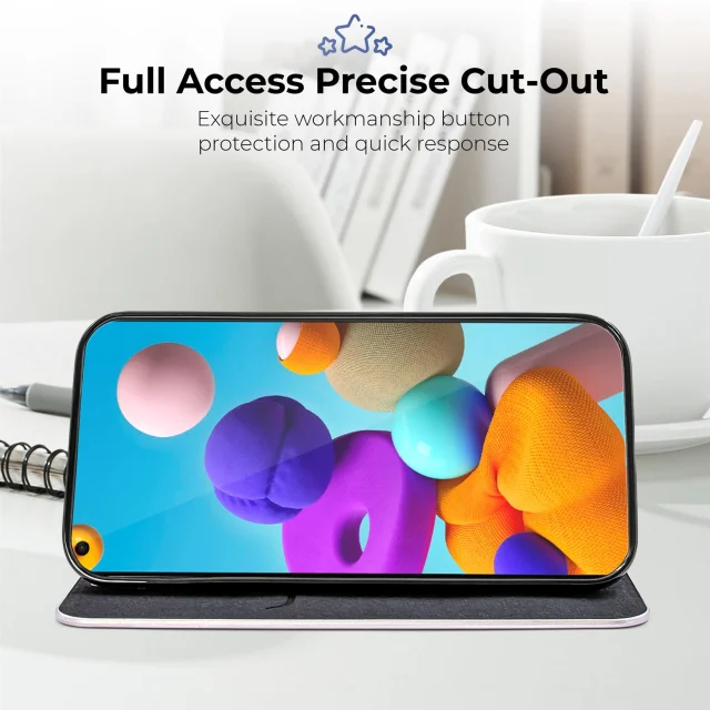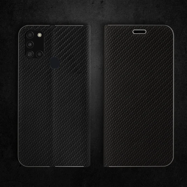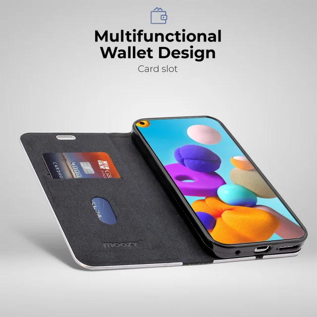 Moozy Venus Wallet Case za Samsung A21s, črn ogljik – kovinska zaščita robov, preklopni ovitek z magnetnim zapiranjem in držalom za kartice