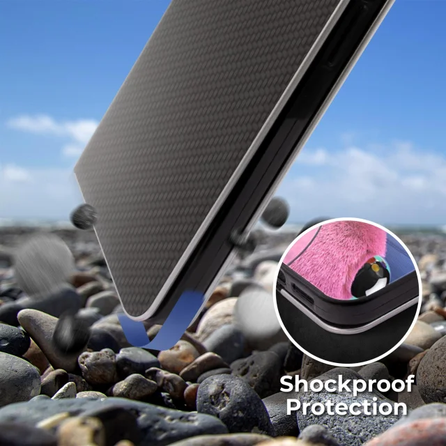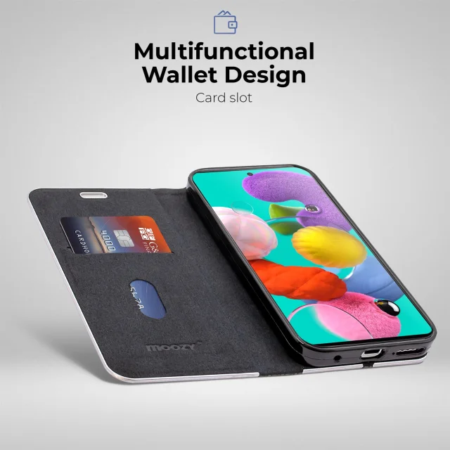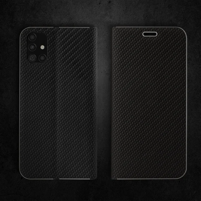 Moozy Venus Wallet Case za Samsung A51, Black Carbon – Metallic Edge Protection Flip Cover z magnetnim zapiranjem in držalom za kartice