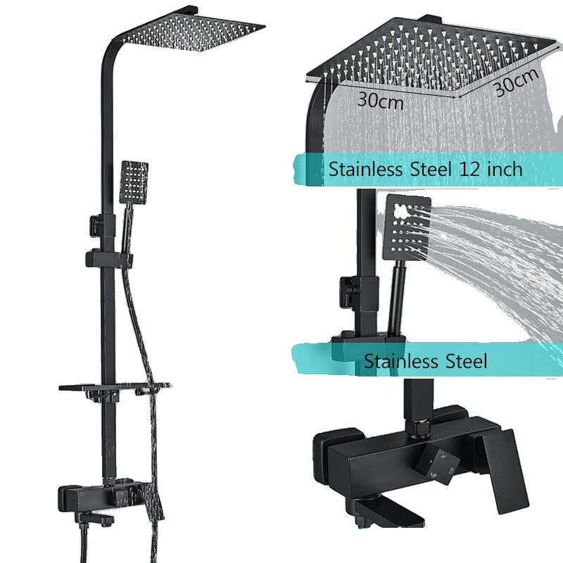 Mosadzný sprchový batériový set, 3-cestný miešací ventil, nastaviteľná výška - Čierna 3cestná 12palcová