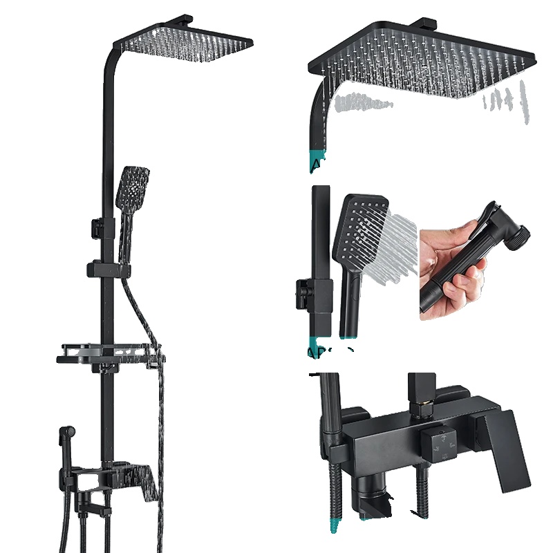 Mosadzný sprchový batériový set, 3-cestný miešací ventil, nastaviteľná výška - Čierna 4way ABS