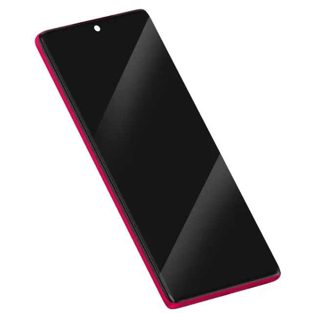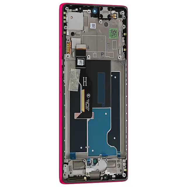 Izvirni celozaslonski združljiv s telefonom Motorola Edge 50 Fusion. Sestavljena enota s predhodno nameščeno prikazno ploščo in črnim oknom zaslona na dotik. Vgrajeno roza ohišje z natančnimi lokacijami za notranje komponente. Predhodno vgrajen priključni kabel za neposredno povezavo z matično ploščo.