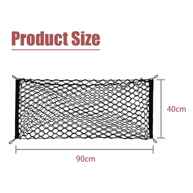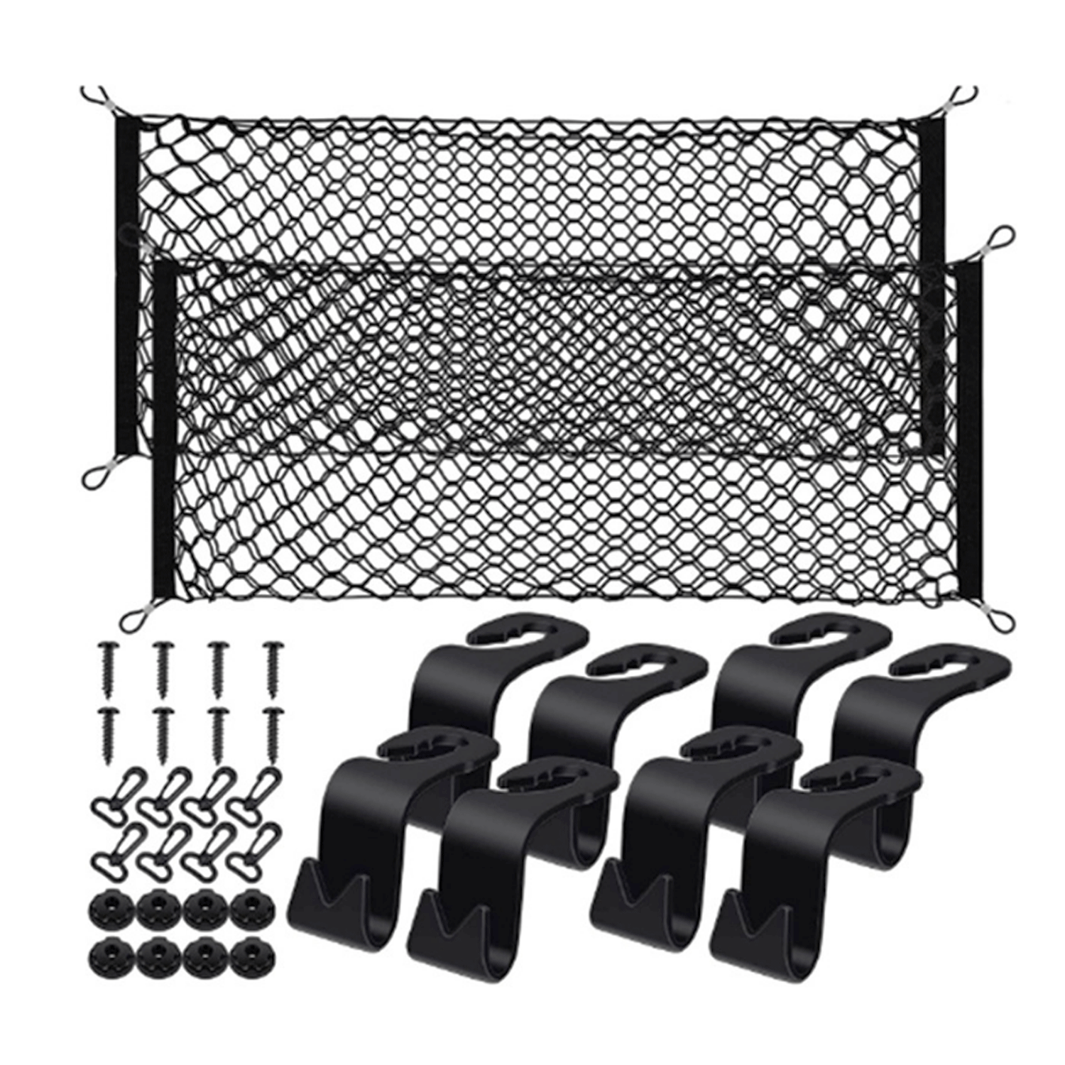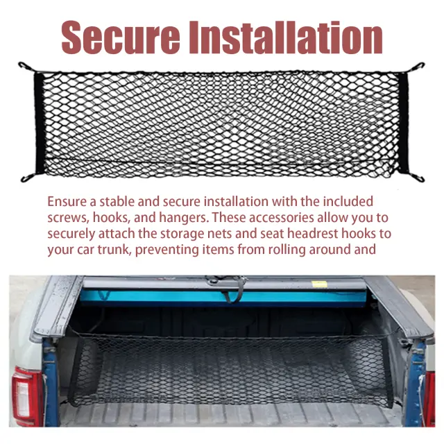 Varna namestitev: Zagotovite stabilno in varno namestitev s priloženimi vijaki, kavlji in obešali. Ti dodatki vam omogočajo, da varno pritrdite mreže za shranjevanje in kljuke za vzglavnik sedeža na prtljažnik vašega avtomobila, s čimer preprečite, da bi se predmeti kotalili in povzročili škodo.