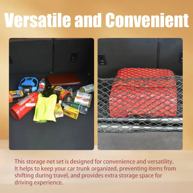 Vsestranski in priročen: ta komplet mrež za shranjevanje je zasnovan za udobje in vsestranskost. Pomaga ohranjati urejen prtljažnik vašega avtomobila, preprečuje premikanje predmetov med potovanjem in zagotavlja dodaten prostor za shranjevanje za izkušnjo vožnje.